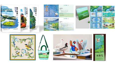 此外,研究院积极参与编写《湿地中国科普丛书》,完成湖南郴州西河、苏州三山岛等10余个国家湿地公园自然教育手册,内蒙古额尔古纳、徐州九里湖、溧阳天目湖等30多个湿地公园与自然保护区的科普宣教课程与体系设计,排版设计《沙家浜四季植物导赏折页》等相关科普资料,以及一系列与在地资源及活动主题紧密相关的文创产品,如以珍稀鸟类朱鹮为灵感的时尚挎包、永恒笔、蓝冠噪鹛丝巾、国际保护动物立牌等,为开展各类主题的科普宣教活动创造便利。