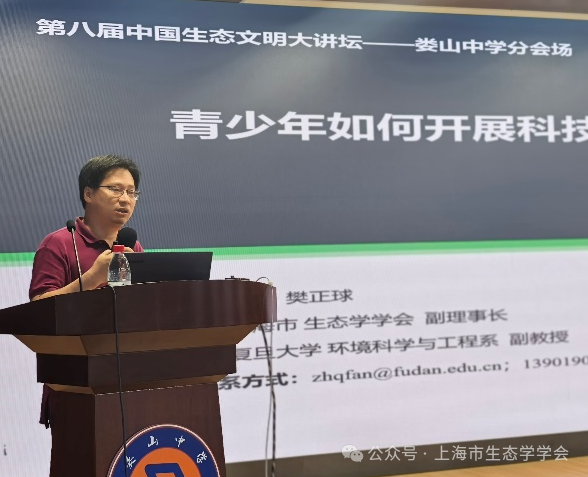 发布时间:2025-09-29 点击量:44为持续深化全国生态日的影响力,第八届中国生态文明大讲坛系列活动将目光投向青少年,聚焦校园内的科学普及与创新能力培养。2025年9月24日,由中国生态学学会和上海市生态学学会指导,长宁区少年科技指导站和娄山中学共同承办的第八届中国生态文明大讲坛分会场活动在上海市娄山中学成功举办。百余位师生齐聚一堂,共同聆听了由上海市生态学学会副理事长樊正球老师带来的题为“青少年如何开展科技创新活动?”的专题讲座。