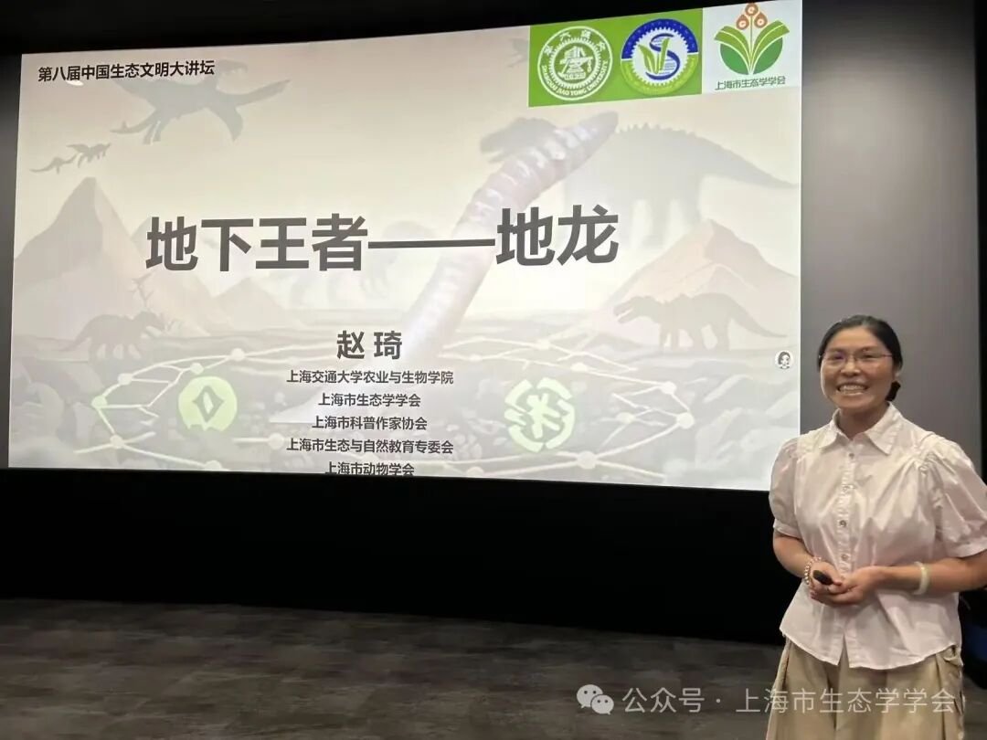 发布时间:2025-10-07 点击量:30为持续深化全国生态日的影响力,第八届中国生态文明大讲坛系列活动将目光投向青少年,聚焦校园内的科学普及。2025年8月31日,在中国生态学学会和上海市生态学学会指导下,上海交通大学农业与生物学院副教授赵琦以“地下的王者——蚯蚓”为题,在上海科学会堂为小朋友们进行了一场科普报告。
