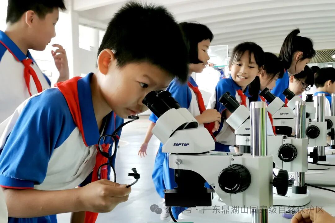 发布时间:2025-10-16 点击量:02025年5月14日,鼎湖山保护区走进肇庆中学附属小学开展“生态知识科普进校园”活动,为师生带来等精彩纷呈的科普体验,共吸引1200名学生参与。活动现场图文并茂的科普展板详细介绍了生活在鼎湖山保护区的鸟类、昆虫、蛇类、兰花等动植物类群,让学生对森林生态系统中丰富的生物多样性有了总体认识。接着,从宏观到微观,学生在工作人员的指导下使用体式显微镜观察真菌、苔藓、甲虫、叶片等自然物,用全新的视角观察到平时不曾留意的细微结构,体会不同生命体的精巧,领略大自然界的奇妙。